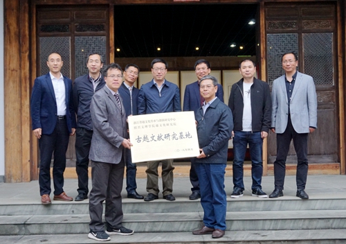 汪俊昌在藏书楼创建人、越文化研究院兼职教授汪柏江陪同下参观了天泉山房藏书库。汪柏江展示了天泉山房多年来在古籍、碑帖、印谱、民间文书等方面的丰富珍藏,介绍了东汉建初大吉碑、晋太康买地莂拓本、明嘉靖刊本《阳明文粹》、民国《遁庵印存》稿本等重要藏品。随后举行了越文化研究院“古越文献研究基地”授牌仪式。