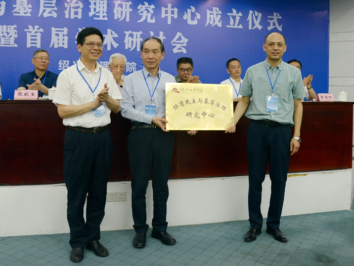 沈赤宣读“协商民主与基层治理研究中心”成立文件和首届中心主任、学术委员会委员、研究员聘任等相关决定。王建力为研究中心授牌,并向首任研究中心主任吴先宁先生颁发聘书。
