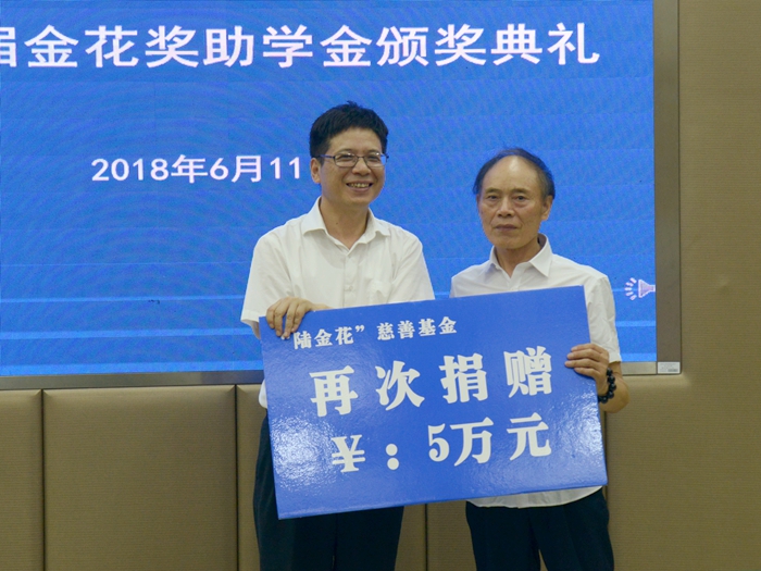 6月11日下午,我校第五届“金花奖助学金”颁奖典礼在铁城科教馆会议室举行。李马鑫先生与其弟弟李兴友先生专程赶到学校,亲自为第五届金花奖助学金获得者颁奖,并再次向陆金花慈善基金注入5万元,目前基金总数已达122万。校长王建力、党委副书记唐和祥出席颁奖典礼。