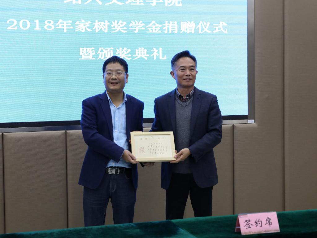 上海家树建筑工程有限公司副总经理陈军与校教育基金会相关人员签订捐赠仪式。唐和祥代表学校接受邹小锋捐赠并向上海家树建筑工程有限公司颁发捐赠证书。陈均土宣读表彰文件。上海家树建筑工程有限公司相关负责人为“家树”奖学金获得者颁发获奖证书。