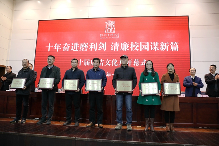 会议发放了《纪检监察法规制度选编》《廉洁文化建设十周年剪影》;举行了2018年度廉洁文化“一院一品”项目授牌仪式,教师教育学院、元培学院、兰亭书法艺术学院、医学院、艺术学院、化学化工学院、外国语学院7家单位的7个项目成为首批品牌项目。