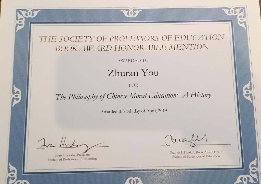 在2019年4月多伦多召开的全美最大教育大会AERA上,我校教师教育学院游柱然教授专著《中国德育哲学史》(The Philosophy of Chinese Moral Education: A History)获得了“教育学教授学会”(Society of Professors of Education)2017—2018年度的优秀图书提名奖。