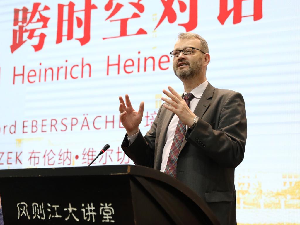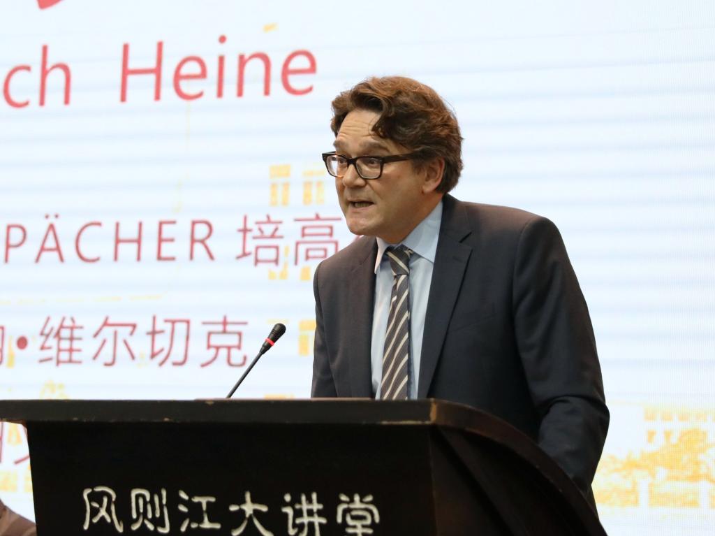 培高德用一口流利的中文向大家讲述了海涅眼中的中国。他用图片的形式展现了海涅作品中提到的中国的陶瓷、中国的丝绸,中国的四书五经、中国语言、文字、历史和中国的地理。