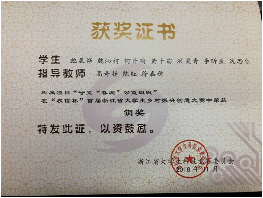 在老师的推荐下,鲍晨烨和团队成员联系到了丽水景宁大张坑村。由于地理位置偏僻,经济落后,这里留守儿童的队伍逐渐庞大,他们大多和年迈的祖辈一起生活。寒暑假期间,鲍晨烨带着团队成员在当地开展了义务教育现状的调研。“在和留守儿童交流时,我发现胆怯、内敛、自卑是他们最大的特点,光靠作业辅导是远远不够的,需要关注他们性格的培养。”帮教扶智,更要扶志,鲍晨烨和团队成员因地制宜,不仅和留守儿童进行面对面的交流,还和当地教师沟通教学方式,多方面帮助大张坑村改善教育现状。此项目在“农信杯”首届浙江省大学生乡村振兴创意大赛中荣获铜奖。