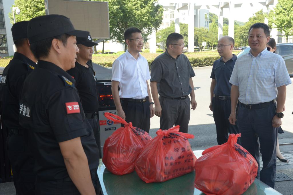 8月2日上午,学校党委书记汪俊昌、党委副书记沈赤、副校长黄坚在党校办、校工会、基建处、学工部、后勤管理处、发展规划处、保卫处等部门负责人陪同下到学校各岗位,走访慰问了暑假期间仍坚守岗位、辛勤工作的教职工们,为他们送去了夏日的清凉和问候。