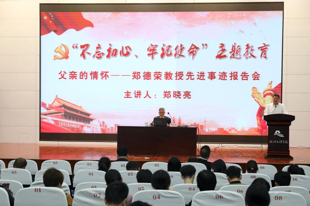 10月25日下午,学校在铁城科教馆一楼报告厅举行“不忘初心、牢记使命”主题教育郑德荣同志先进事迹报告会。郑德荣同志三子郑晓亮应邀报告了郑德荣同志的先进事迹。校党委副书记沈赤,副校长柳国庆,校党委委员、宣传部部长陈均土出席报告会。教师党员和学生党员代表参加了报告会。沈赤主持报告会,他希望我校师生能认真学习宣传郑德荣同志先进事迹,进一步聚焦先进,鼓舞精神,激发干劲。