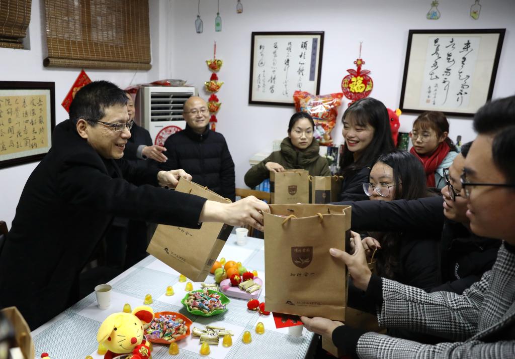 1月22日,农历腊月廿八,校长王建力走进公寓和书院,向在校过年的国内外学生送上新春祝福,共迎庚子年的到来。党办校办、学工部、研究生工作部、国际教育学院等部门负责人陪同慰问。