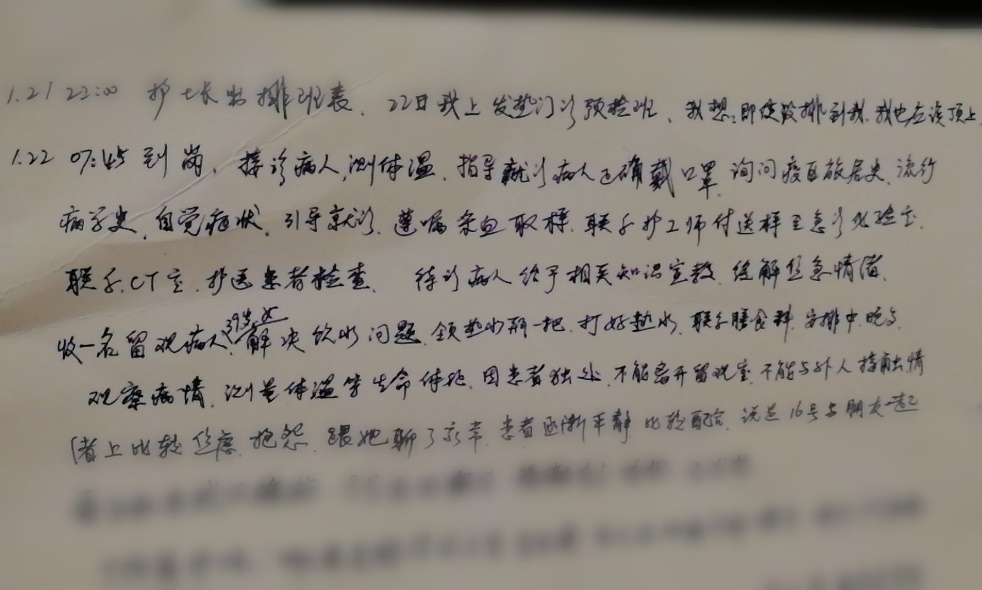 1月22日,第一天的工作在测体温、采血样、联系急诊检验、联系CT室、为发热患者做宣教、为留观病人联系饮水送餐等琐碎的事情中过去,因观察到留观患者因被要求不能离开医院而有所抱怨,卫英红还热心地与她交流,缓解患者的焦虑与不安。因为熟悉流程,第二天卫英红仍然坚守在发热门诊预检处,根据自己的工作经验提出了更多防护安全方面的细节建议。