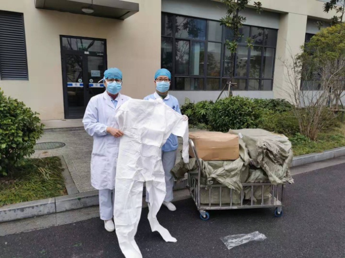 2月4日一早,我校附属医院放射科主管护师应华萍把省内爱心人士募集的250套防护服送到发热门诊倪晶贞护士长手上。这是医技第二党支部的党员和放射科的医务人员在得知绍兴市内防疫物资紧缺后,第一时间发动一众爱心人士,联系到远在内蒙古的防护服生产厂商,为战“疫”一线的战士们寻来这宝贵的“盔甲”。