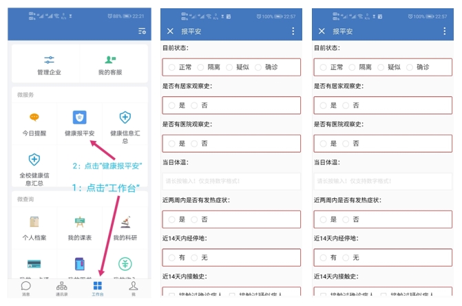 进入企业微信APP——点击下方“工作台”版块——点击微服务栏目下的“健康报平安”进入系统如实进行填报,填报完成所有选项后才能进行提交。
