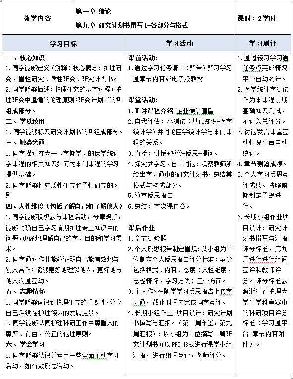 护理研究采用以学为中心的教学理念,以一致性建构为课程设计基本原则,从有意义学习分类法6个维度(核心知识、学以致用、触类旁通、人性维度、价值情怀和学会学习)制定学习目标,学习活动和学习测评。课程共9次课,采用线上线下混合式教学模式,以面授为基础(疫情期间采用直播方式),以学习通(超星泛雅)课程平台为线上依托,借鉴中国大学mooc平台中相关课程,以护理研究基本过程为理论学习主线,以一个小组任务(项目设计:撰写一份护理研究计划书)及其衍生的个人作业和小组作业为知识技能运用主线,以测验、讨论、知识分享、个人反思活动等为辅助,完成围绕护理研究计划书撰写(其内容组成部分实质是护理研究基本过程)的“边学边用”、螺旋式学习。