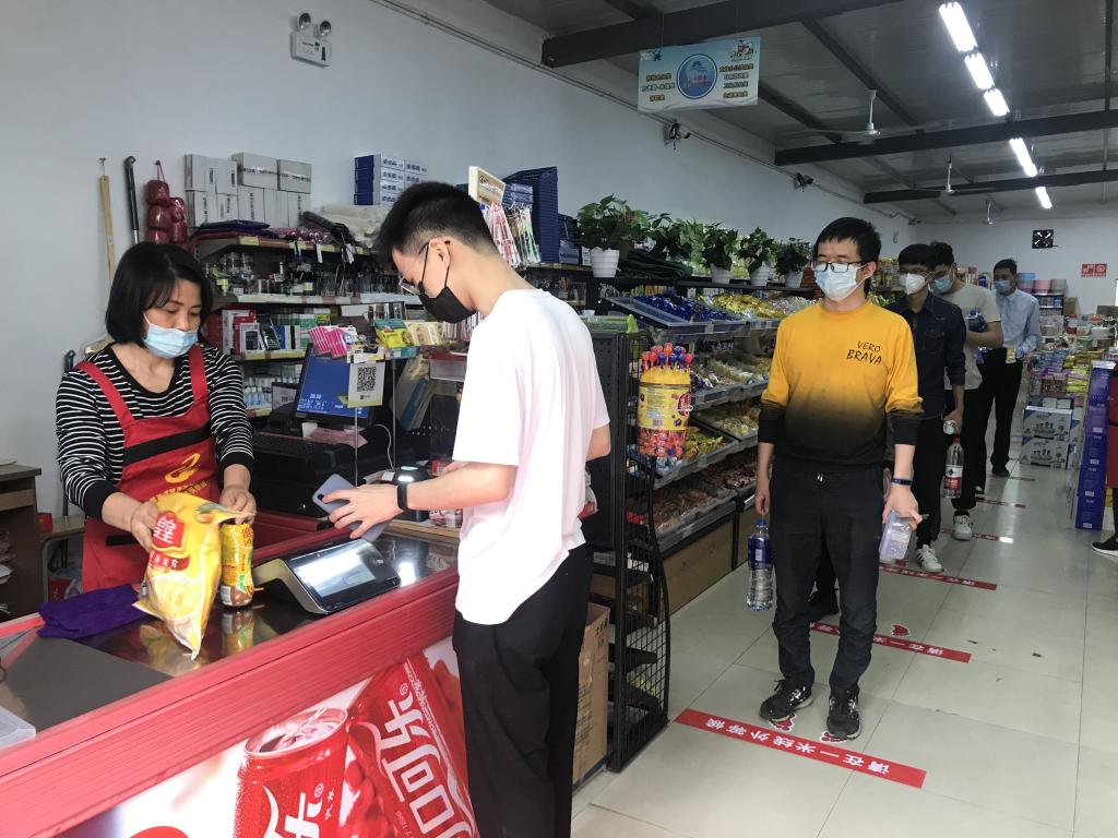 学校超市是校内人群密集度较高的公共区域,资产经营公司严格落实消毒通风工作,每天对地面、货架、自动售货机、收银机等实行消毒;严格把好入口关,师生必须戴口罩、体温检测后方能进入;严格执行出入口分离和“一米线”收银制,减少人员交叉感染风险。