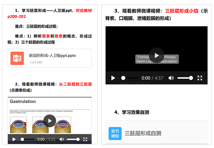 本课程的教学过程与大多数网课大同小异。以第3周的课——三胚层形成和分化这一节为例,课前推送课件和微课视频帮助学生提前熟悉适合自主学习的内容(图8);学生在讨论区留下自主学习过程中遗留的问题(图9)