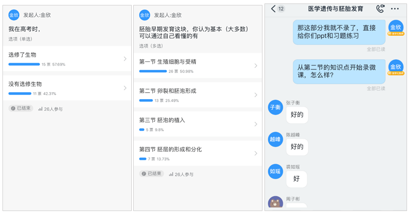 2.学生学习基础调研。在第一次课“绪论”前,我录制了三个微课:课程概述(含课程简介、总体学习目标、学习意义和考核办法等)、医学遗传学概述和胚胎发育概述。学生提前观看后进行了学习自测,同时,我调研了学生高考选考情况,结果显示全班有14人高考选考了生物,11人未选考。