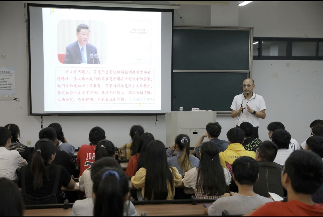 自9月开学以来,全校上下掀起了学习贯彻习近平总书记关于教育重要论述的热潮。让《讲义》“进教材、进课堂、进头脑”,让教师们把开学“思政第一课”上得更有“底气”,学校下足了功夫。马克思主义学院多次组织思政课教师在暑期进行集体备课,并邀请北京师范大学博士生导师冯刚教授作专题讲座;领导班子与思政课教师进行实时研讨,对课程教学设计、课程内容衔接等进行研判,使课程设计与《讲义》结合得更加紧密;教研室通过反复修改,多次“打磨”,最终形成了制作精良、内容优化、案例鲜活的教学讲义与课件。