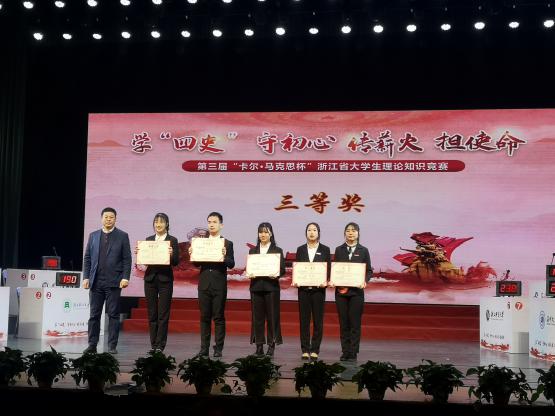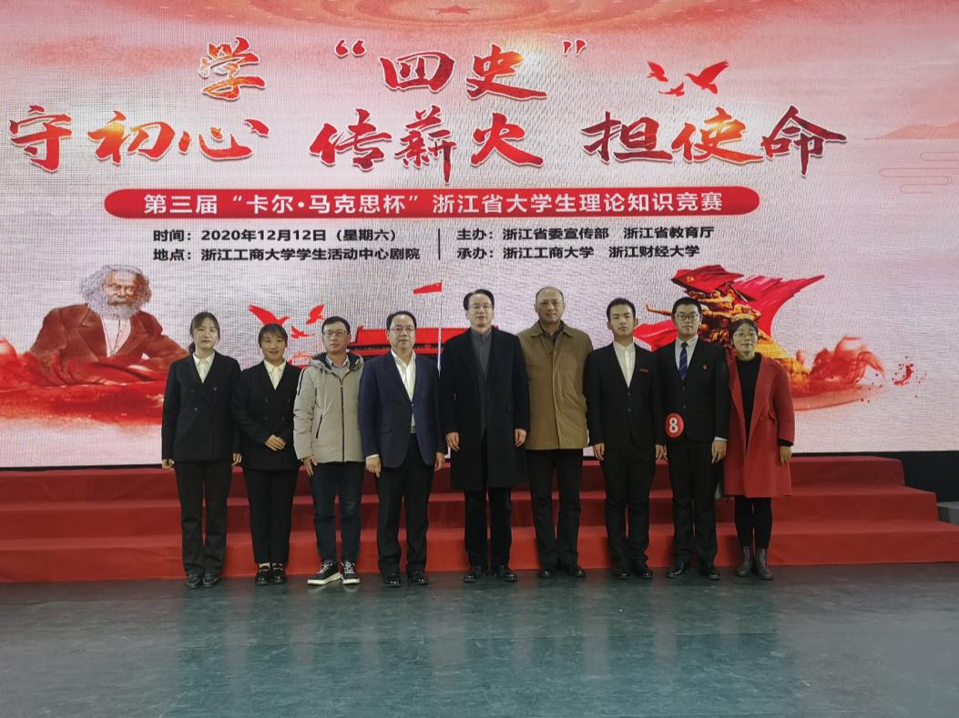 12月12日,第三届“卡尔•马克思杯”浙江省大学生理论知识竞赛决赛在浙江工商大学举行。经过激烈角逐,我校参赛团队荣获三等奖。校党委副书记张宏,党委委员、宣传部部长梁瑜,马克思主义学院负责人和师生代表等前往现场观战助威。