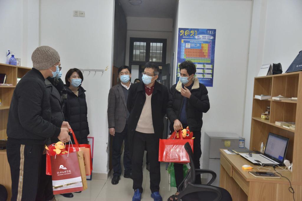 2月11日除夕当天上午,校长王建力看望慰问春节期间留校学生。党办、校办、学工部、研究生处、保卫处、后勤管理处等职能部门负责人陪同。
