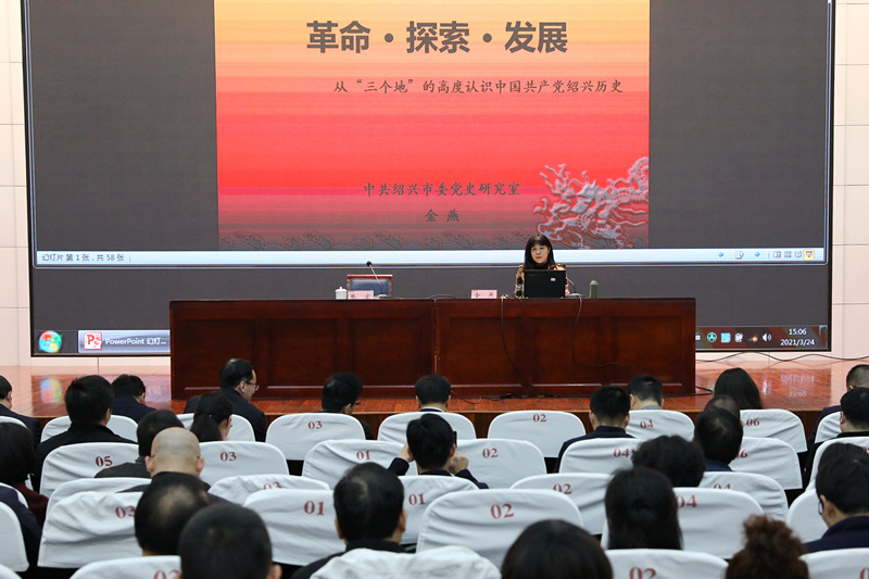 动员部署会后,市委党史室副主任金燕为大家作了题为《革命 • 探索 • 发展——从“三个地”的高度认识中国共产党绍兴历史》的专题辅导报告。她从党的历史上三次大规模的党史学习教育讨论活动讲起,全面总结回顾了我们党历来重视党史学习教育,深刻阐述了学习党史需把握的几个问题。从“三个地”的高度分不同历史阶段,系统、生动地阐述了中国共产党在绍兴的发展历史,展现了绍兴在各个历史时期的创新开拓举措和广大党员干部为中国革命、发展事业作出的巨大贡献。