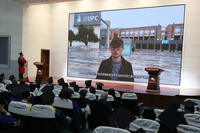 商学院工商管理1801班金珂亦和人文学院中国语言文学1702班巴西娅(马达加斯加)代表毕业研究生发言。商学院2020届企业管理专业胡小芳和土木工程学院2020届建筑与土木工程专业莫洋洋作为优秀校友代表分别与学弟学妹们分享了职场与读博经验。