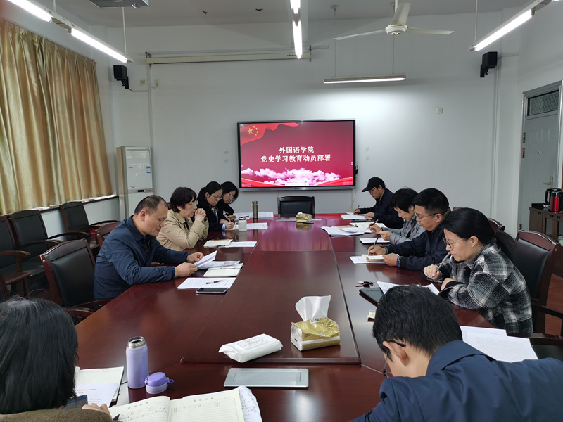 4月7日,外国语学院召开党史学习教育动员部署会,学院党政领导班子成员、各科室系部负责人、党支部书记参加会议。