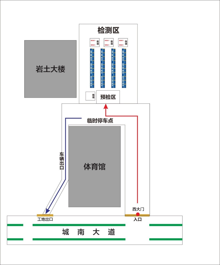风则江校区:统一从西大门进校,沿体育馆绕(红色箭头方向行进),接送车辆、陪同人员在同学下车后立即驶离校园(蓝色箭头方向行进)。
