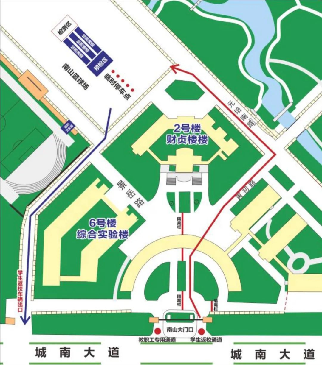 南山校区:统一从正大门东侧进校至篮球场(红色箭头方向行进),接送车辆、陪同人员在同学下车后立即驶离校园(蓝色箭头方向行进)。