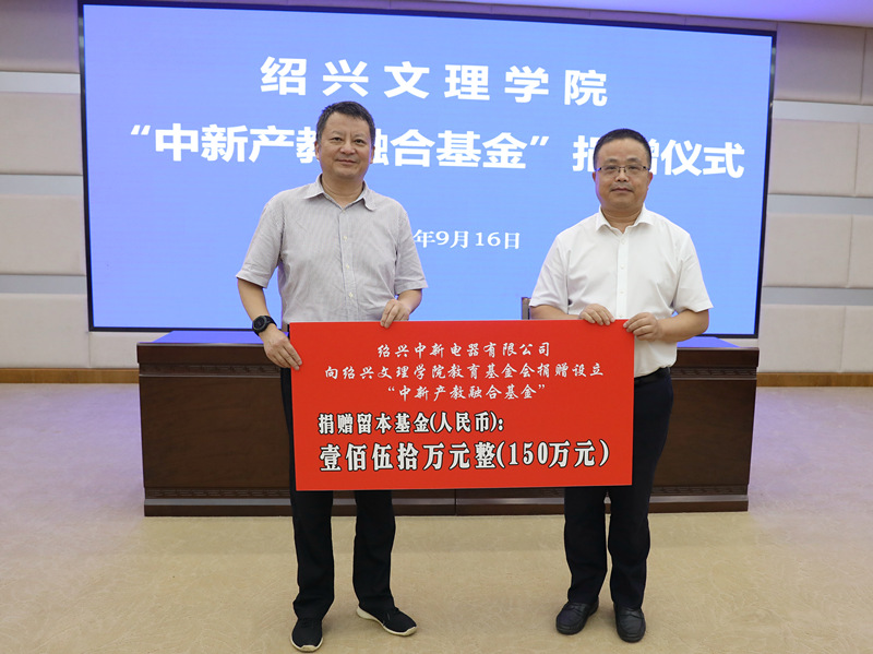 9月16日下午,“中新产教融合基金”捐赠仪式在我校图书馆报告厅举行,校党委副书记沈赤、绍兴中新电器有限公司董事长邵德夫、对外联络处相关负责人、机械与电气工程学院领导班子成员和师生代表参加捐赠仪式。绍兴中新电器有限公司在我校设立150万元留本基金,支持机械与电气工程学院深化产教融合和校企合作。