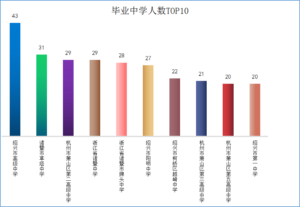 在来自天南地北的莘莘学子中,毕业于绍兴市高级中学的小伙伴人数最多,达到了43位,校友团人数不错哟!