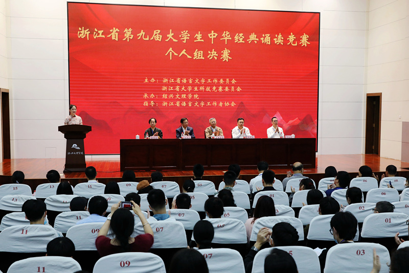 10月16-17日,浙江省第九届大学生中华经典诵读竞赛决赛在我校举行。10月16日下午,决赛开幕式在铁城科教馆举行,浙江省语言文字工作者协会会长、省大学生中华经典诵读竞赛组委会副主任王建华,浙江省语委办主任、省大学生中华经典诵读竞赛组委会副主任朱鸿飞,副校长、校语委主任、浙江省大学生中华经典诵读竞赛组委会副主任柳国庆,浙江师范大学教授、浙江省大学生中华经典诵读竞赛专家委员会主任傅惠钧,绍兴市语委办主任、市教育局副局长、绍兴市大学生中华经典诵读竞赛组委会主任丁初效,绍兴市教育局和代表高校相关负责人,仲裁组全体专家以及来自全省84所高校的领队和选手参加决赛开幕式。