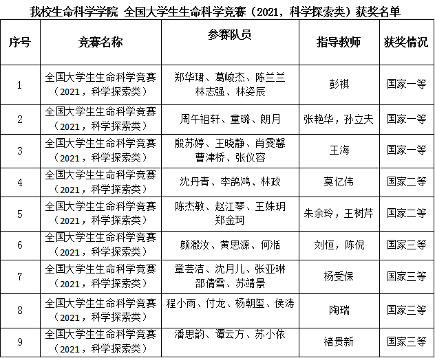 近日,第五届全国大学生生命科学竞赛落幕,我校生命科学学院、化学化工学院学子在比赛中获佳绩。在科学探索类赛道中,生命科学学院获得国家一等奖3项,二等奖2项,三等奖4项;在创新创业赛道中,学校获国家一等奖3项(化学化工学院2项,生命科学学院1项),二等奖2项(化学化工学院1项,生命科学学院1项),三等奖7项(化学化工学院5项,生命科学学院2项),获奖数量创历史新高。