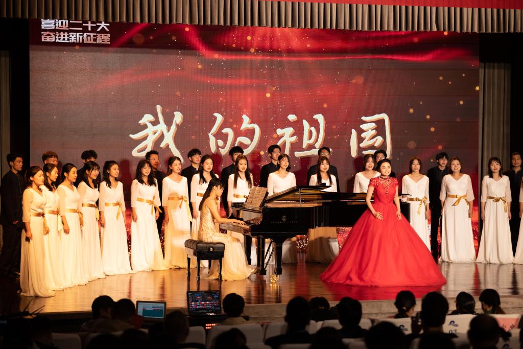 音乐会分为古韵新曲、多彩新声、时代新篇三个乐章,从不同侧面展现党的百年奋斗历程,弘扬浙江精神,传承地域文化。第一乐章的歌曲演唱《都说江南好》、古筝协奏《陆游与唐婉》、竹笛独奏《牧笛》、歌曲演唱《兰亭颂》等4首曲目生动形象地展现出越文化的深厚底蕴,弘扬“干在实处、走在前列、勇立潮头”的浙江精神。第二乐章的歌曲演唱《多情的土地》、钢琴独奏《中国风味音乐会练习曲两首——皮影戏、向中国致敬》、扬琴独奏《湘墨》、歌曲演唱《父亲的草原母亲的河》、小提琴独奏《花儿为什么这样红》等5首曲目凸显自强不息、坚韧不拔的中国精神,唱响献给党和祖国的赞歌。第三乐章萨克斯独奏《月宫》、歌曲演唱《向往》、双钢琴演奏《红旗颂》等新时代音乐作品慷慨激昂,用音符生动描绘出十年奋斗历程,抒发中华儿女永远跟党走、奋进新时代的豪情壮志。大气恢宏的歌曲《我的祖国》随后唱响,《歌唱祖国》的主旋律在校园上空久久回荡……