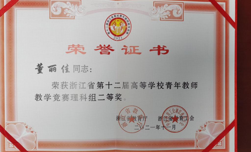 董丽佳在2021年浙江省第十二届青教赛中取得了的一定的成绩,这项奖项对她来说意义重大。董丽佳表示,在参加比赛的过程中,她深刻理解了如何讲好一门课。“大学的课堂上,学生一定是上课的主角,知识一定不是陈旧的,案例一定是鲜活的!”在她看来,优秀的教师能引经据典、了解前沿、激发学生学习兴趣,课程思政也是春风化雨,自然融入学生的内心。与此同时,因为要把前沿内容融入课堂,老师自己也会阅读大量文献,这使她的眼界大大拓宽,对自己的课程的理解也更加深入。
