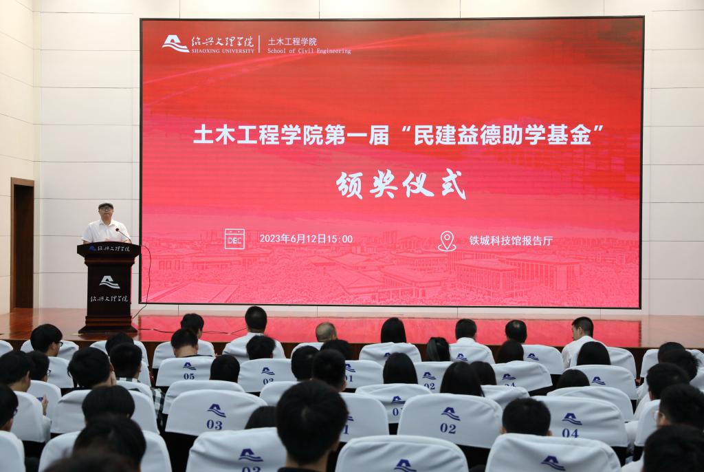 6月12日下午,第一届“民建益德助学基金”颁奖仪式在铁城科教馆举行。民建绍兴市委会专职副主委兼秘书长李月红,“民建益德助学基金”设立者、浙江益德环境科技有限公司董事长赵建明出席颁奖仪式,并为获奖学生颁奖。校党委副书记沈赤,副校长陈均土出席仪式,学校相关部门负责人、土木工程学院师生代表参加仪式。