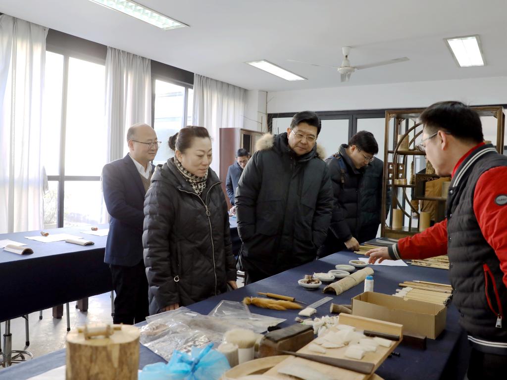 调研期间,崔英兰一行实地参观了兰亭书法艺术学院展厅、中华优秀传统文化传承基地(书法)竹雕工作坊等教育教学场所。