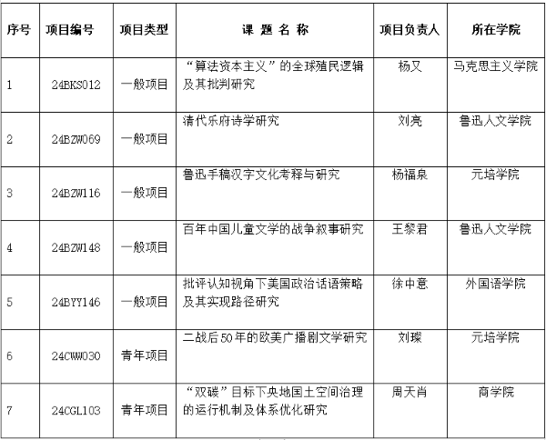 近日,2024年国家社会科学基金年度项目立项结果正式公布,我校共计获批7项,其中一般项目5项、青年项目2项,获批数量为近年新高。具体名单如下: