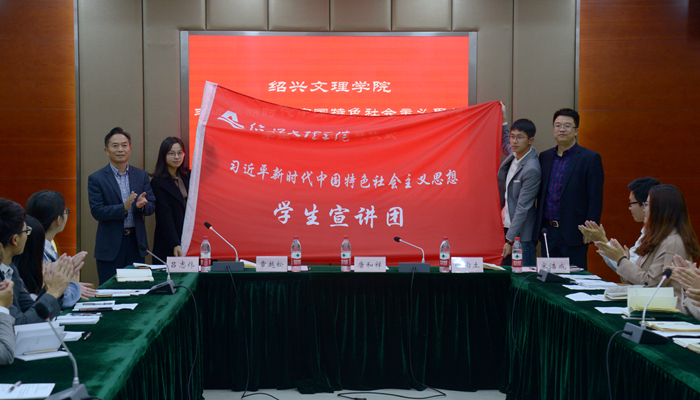 在成立仪式上,唐和祥、陈均土向研习会和宣讲团授旗。马克思主义学院思政151班钱颀峰同学、生科院酿酒1511班李诗怡同学代表学生研习会和宣讲团接旗。