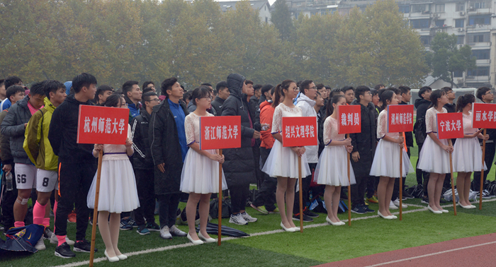 11月20日,2017年浙江省校园足球高校超级组联赛在我校河东校区田径场拉开帷幕。联赛由省教育厅、省体育局主办,省大学生体育协会执行,我校承办,省大学生体育协会足球分会协办。副校长寿永明、省教育厅体卫艺处处长李建章、省大学生体育协会常务副秘书长姜丽、省大学生体育协会纪律监察部主任胡振浩、省大学生体育协会足球分会常务副秘书长董海宇,各参赛高校足球代表队教练员、运动员、裁判员参加开幕式。