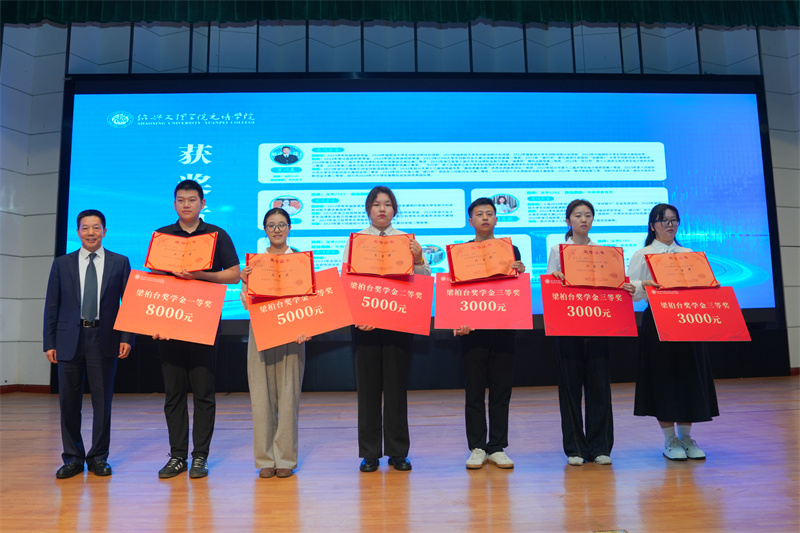 翁国民为首届“梁柏台奖学金”获奖同学颁发证书