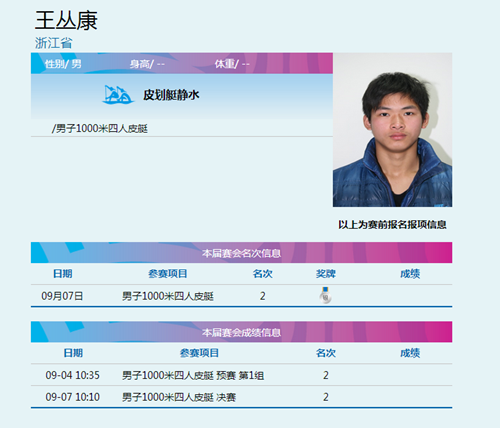 8月27日到9月8日,中华人民共和国第十三届全国运动会在天津举行,其中皮划艇静水项目于9月3日到7日在天津海河吉兆桥段开赛。经过激烈角逐,体育学院运动训练16级学生王丛康获得皮划艇静水1000米四人皮艇亚军,并成功入选国家队。