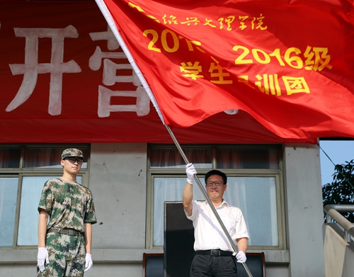 汪俊昌向军训团授旗,标志着2015、2016级学生集中军事训练正式开始。