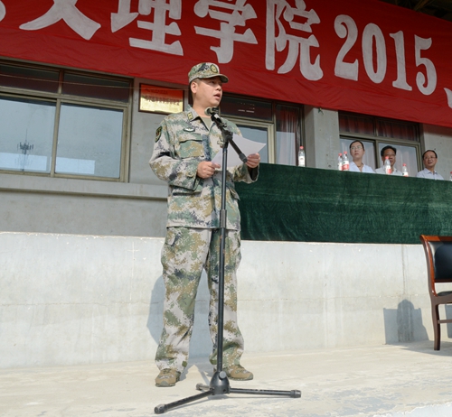 赵灵刚作讲话。他指出,军训是大学生在校期间接受军事训练、熟悉国防知识的第一课堂,是大学生涯一段难忘的记忆。他希望同学们把军训看做一次勇于挑战自我的难得机会,以军人的标准严格要求自己,通过军训练就坚强的体魄、顽强的意志、严明的纪律。他同时要求全体承训教官严于律己、以高标准严要求完成此次军训任务。
