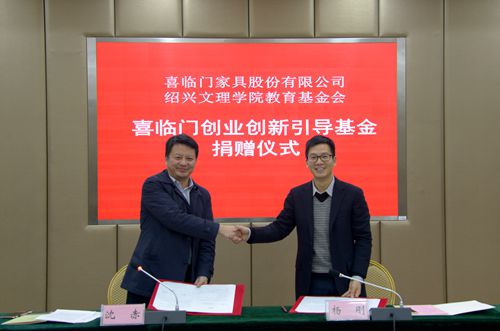 捐赠仪式上,杨刚与沈赤分别代表喜临门家具股份有限公司和我校签订捐赠协议。沈赤代表学校接受捐赠并向喜临门公司颁发捐赠证书。