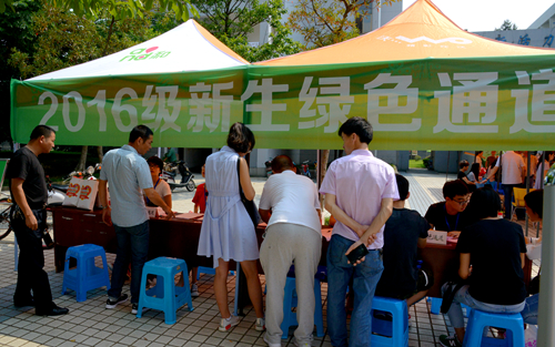 迎新当日,天气比较炎热,校园临时搭起了一顶顶清新的帐篷,上面注明新生签到处、生活用品领取处、家长服务点等,以方便新生及家长办手续或休息纳凉。此外,学校设置专车往返车站进行不间断接送,在校门口以及校园主要道路上都有工作人员或学生志愿者驻点举牌,提供咨询服务等。