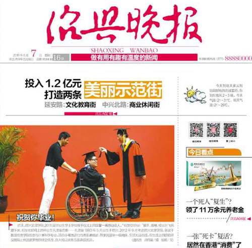《钱江晚报》等媒体纷纷报道叶飞帆校长与轮椅上毕业生的合照故事