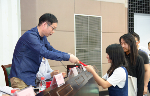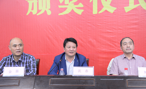 沈赤在讲话中向长期出资出力关心学校建设发展的鲍贤伦校友、王震校友表示崇高的敬意和衷心的感谢!向获得2016年兰亭奖学金的各位同学表示热烈的祝贺!他指出,兰亭奖学金来自滕伟石书法教育基金。自滕校长成立书法教育组织、开创书法教育以来,一代代文理人薪火相传,脚踏实地,坚守创业,书法教育从书法教研组发展成了兰亭书法艺术学院,获得了国家教学成果二等奖,“兰亭书法学堂”走出了国门。在兰亭奖学金的激励和引领下,先后有21 名同学考取中国人民大学、天津美术学院等高校的硕士研究生,97人次在省级展览入展、获奖,8人次在全国展览入展、获奖。他希望获奖同学能常怀感恩之情,努力以自己的实际行动和优异成绩回报鲍贤伦、王震校友以及老师、父母的期待;希望全体同学把奖学金作为一种鞭策,使学习的全过程转变成一个努力进取、追求卓越的过程;希望书法艺术学院要立足实际、加强研究、规范管理,评好奖项,注重过程,运好结果,让兰亭奖学金能够成为引领学生立志成才、追求卓越的一个重要载体。