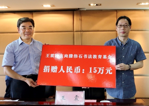 滕伟石书法教育基金由我校老校长滕伟石的女儿王挺校友和女婿鲍贤伦校友依照滕校长生前遗愿捐资设立,以此纪念滕校长和发展书法艺术教育。此次,王震校友将出资15万元,增资滕伟石书法教育基金,每年拿出3万元,以兰亭书法奖学金的形式,专门奖励在考研、毕业创作、学生科研及社会实践等方面有所突破且成绩优异的书法学专业学生。