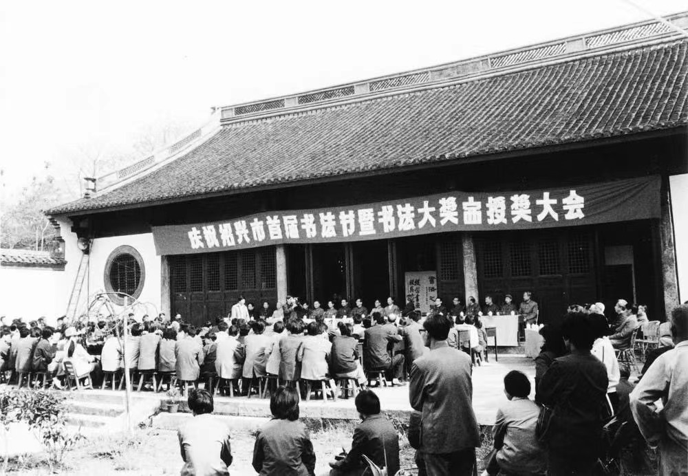 在中共绍兴历史展陈里,绍兴市首届书法节的照片格外吸人眼球:庭院里,台上台下都坐着人,屋檐下挂着一条长幅,上面写着:“庆祝绍兴市首届书法节暨书法大奖赛授奖大会”。